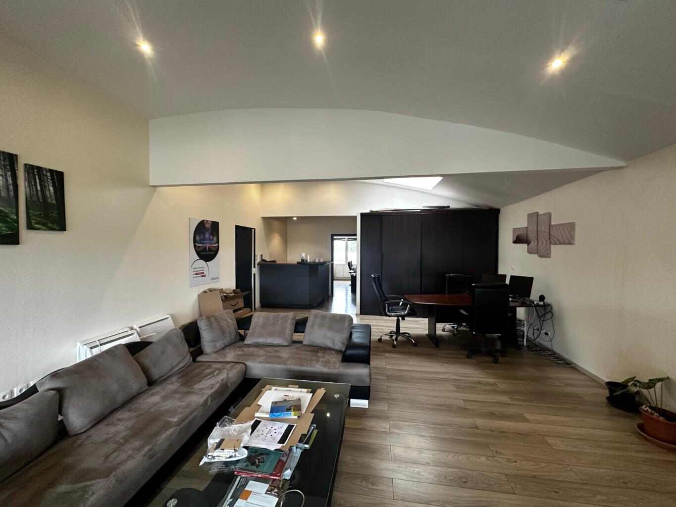 Un grand open space lumineux avec skydome, trois bureaux individuels fermés.