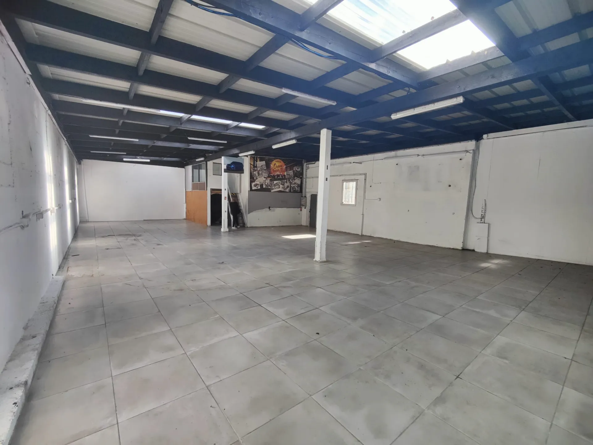Il comprend un grand espace avec une porte sectionnelle électrique et manuelle, carrelé au sol, et un sanitaire.