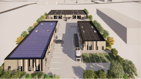 Places de parking en extérieur et bornes de recharge pour véhicules électriques.