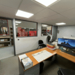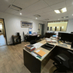 4 Bureaux cloisonnés + 1 salle de réunion + réfectoire aménagements superficie environ 147 m2 : faux plafonds, carrelage, sanitaires avec 2 Magasin pour petit stockage : 38 m2